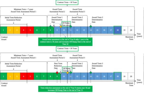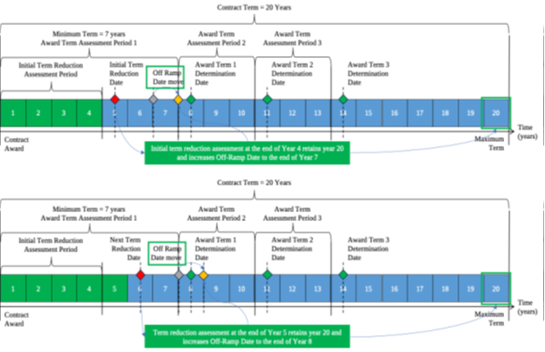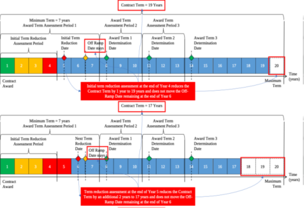 - Poor Performance Scenario: If the seller fails to meet the performance requirements, the contract term is reduced by between 1 to 3 years, depending on the severity of the performance issue. In subsequent years, if performance does not improve, further reductions may be applied. If the seller cannot rectify performance issues, the Off-Ramp option allows the buyer to terminate the contract and re-tender the scope of the contract.
